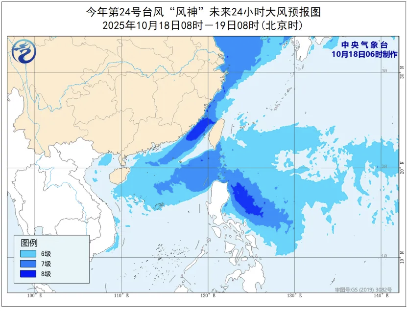 受冷空气和“风神”的共同影响,18日8时至19日8时,台湾海峡、巴士海峡、南海北部将有6至8级、阵风9至10级的大风。