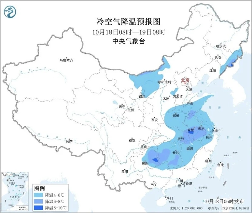 我国中东部大部地区气温将下降4℃至8℃,局地达10℃。气象专家提醒,今晨,东北、华北、黄淮等地降温剧烈,北京(南郊观象台4.5℃)、天津(西青3.5℃)等地均出现今秋以来的最低气温,体感寒冷,大家外出时需注意添衣保暖。